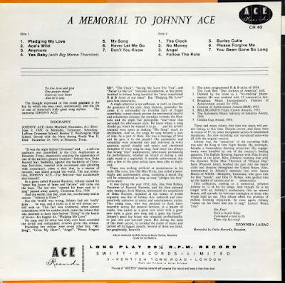 I don't have this - but it looks like the best buy if you really want to immerse yourself in Johnny Ace. A 2 CD set from Fantastic Voyage with 55 tracks. Includes all his released singles plus session work plus "tribute records" by other artists. Probably out of print but worth keeping a lookout for this one.